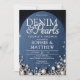Um convite de chá moderno, elegante e chique, denim e pérolas, com tema de denim e diamantes e pérolas. Apresenta um fundo denim, elegantes rochas e pérolas (são efeitos digitais, não pedras reais ou pérolas!) letras personalizadas para a palavra "pérolas" e tipografia em branco. Um chá de casamento chic "denim, diamantes e pérolas" para um casal moderno que ama denim.