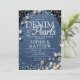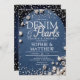Um convite de chá moderno, elegante e chique, denim e pérolas, com tema de denim e diamantes e pérolas. Apresenta um fundo denim, elegantes rochas e pérolas (são efeitos digitais, não pedras reais ou pérolas!) letras personalizadas para a palavra "pérolas" e tipografia em branco. Um chá de casamento chic "denim, diamantes e pérolas" para um casal moderno que ama denim.