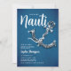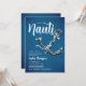 Um convite de aniversário moderno, elegante e chic com um tema de denim e diamantes e uma manchete de tendências: "Vamos Get Nauti". Ele apresenta um fundo denim com uma matiz azul, pastel, uma âncora de barco coberta por rochas (este é um efeito digital), e tipografia em branco. Um design de "denim e diamantes" chico para uma mulher no seu aniversário!