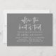 Anuncie e partilhe a sua alegria para sempre em estilo com o nosso moderno tema design (Depois do nó estar ligado) cartão de convite para comemoração de casamento. É ideal para casais que decidiram celebrar o seu melhor dia. Com seu design sofisticado, mas lúdico, este convite certamente define o tom de um evento inesquecível. A carta de convite apresenta uma design moderna, cinza escura temática, acrescentando um toque de elegância do eterno à sua celebração. Projetado por TeeshaDerrick