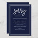 Este simples e elegante anúncio azul de marinho é uma maneira de se desculpar com clientes ou amigos quando você precisa cancelar, remarcar ou adiar um evento ou casamento. O script manual moderno e branco adiciona um toque de na moda, enquanto o quadro retangular adiciona uma aparência formal e clássica. Use esses cartões de anúncio para qualquer cancelamento, adiamento ou reprogramação.
