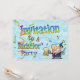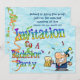 Papel azul claro amassado como fundo com letras coloridas em cores de arco-íris decorado com serpentinas de papel laranja e verde convidando a turma para uma despedida de solteiro. Para coroar tudo, há um cara de desenho animado cômico usando um chapéu de festa e segurando um caneco cheio de cerveja, com mais serpentinas voando ao seu redor. Um design divertido para uma ocasião feliz.