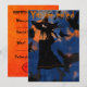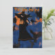 Convite de festa de Halloween de desenho animado de bruxa em vassoura voando pela noite com uma variedade de pássaros pretos e abutres. Colorido com laranja, preto e azul escuro.