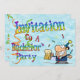 Papel azul claro amassado como fundo com wordart em cores de arco-íris decorado com serpentinas de papel em laranja e verde convidando a galera para uma despedida de solteiro. Para coroar tudo, há um cara de desenho animado cômico vestindo um chapéu de festa e segurando um caneco cheio de cerveja, com mais serpentinas voando ao seu redor. Um design divertido para uma ocasião feliz.