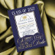 Ouro elegante, design branco e azul para uma festa de formatura, personalize cada parte do texto. Salve o design de data incluído com a inscrição manual. Elemento de chapéu de graduação incluído. A graduação pode ser do segundo grau, da universidade ou da faculdade.