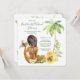 Convite de despedida de solteira para um fim de semana de festa na praia apresenta noiva afro-american em maiô e cenário tropical. Itinerário de fim de semana de 4 dias no verso. Fim de semana de 3 dias disponível.