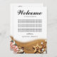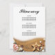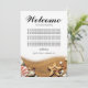 Cartão de boas-vindas de casamento com destino à praia com um fundo branco simples, praia arenosa com uma estrela-do-mar e conchas.