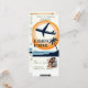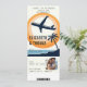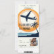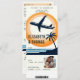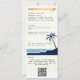 Um design de moda de um convite de casamento de passagem de avião com um tema de destino tropical (Havaí etc.) com uma ilustração moderna de um avião decolando ondas azuis e uma palmeira, com o brilho do sol no fundo, vai deliciar casais e convidados, ansiosos pelo grande dia. Modelo para uma foto do casal feliz. Um convite de casamento moderno que inclui os detalhes no verso e o cartão RSVP com um código QR.