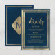 Uma aquarela azul naval e dourada luxuosa minimalista moderna com tipografia manuscrita dourada elegante e trendy. Este Cartão de Detalhes de Casamento glamoroso é o impresso perfeito para o evento de Casamento de qualquer noiva e noivo. Personalize este design com seus detalhes e inicial do monograma.