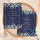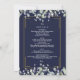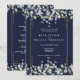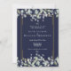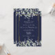 Um convite de casamento elegante e completo com folhas de sage e lilás que caem sobre uma moldura dourada elegante, encerrando os detalhes do seu casamento em texto clássico e elegante sobre um fundo azul marinho. Personalize com todas as informações especiais do seu dia de casamento no verso, incluindo seu RSVP, acomodação e detalhes adicionais. Criado por Thisisnotme