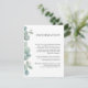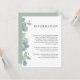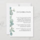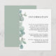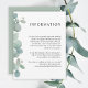 Uma bela moldura de folhagens de eucalipto em aquarela destaca este cartão moderno de informações de casamento usado para fornecer aos seus convidados detalhes, acomodações de hotel, site de casamento ou outras informações úteis relacionadas ao seu casamento. Personalize o texto de exemplo mostrado no modelo de texto com os detalhes desejados. Esses cartões podem ser enviados como um anexo com os convites de casamento. Uma suíte de produtos de papelaria combinantes está disponível neste design para coordenar seu casamento ou evento com um estilo lindo.