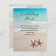 Cartões de detalhes do casamento na praia com duas estrelas-do-mar e imagem de fundo da cena da praia. Inclui detalhes do evento com fonte de letra moderna para o título e fonte de letra impressa para as informações. Água do oceano tropical e areia da praia são o pano de fundo para sua redação personalizada. Os cartões vêm em muitos tamanhos e este design e redação podem não se ajustar corretamente a todos. Será impresso como no preview.