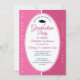 Na moda, convite para a graduação moderna com cor rosa vibrante no tema cor rosa. Mensagem inspiradora A DEUS SER A GLÓRIA, para que você possa celebrar sua fé assim como seu sucesso. Plano de fundo rosa claro com GRADUAÇÃO em padrão em série. O texto do marcador de posição é personalizável, portanto, simplesmente adicione seu nome e detalhes. Parte da coleção GRADUATION de Designs Bereanos.