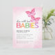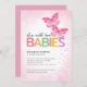 Este adorável convite para chás de fraldas de temas para borboletas apresenta duas borboletas cor-de-rosa para um convite temático para meninas gêmeas. O design é acentuado com o texto lúdico "devido a dois BEBÊS", que combina a letra da moda com letras de blocos multicoloridas para um convite alegre.