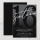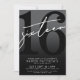 Convite de Aniversário de Dezesseis Anos Preto e Cinza Escuro. Celebre os dezesseis anos com estilo com este design ousado e sofisticado. A metade superior apresenta um grande "16" preto com um "dezesseis" em letra cursiva branca sobreposto, destacando-se contra um fundo cinza escuro para um visual preto e branco. A parte inferior é cinza escuro sólido com detalhes do evento em uma fonte branca sem serifa para um visual moderno e marcante. As cores são totalmente personalizáveis.