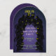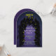 Um convite para o Dia das Bruxas roxo enquadrado por um arqueiro de silhuetas de gatos pretos com olhos assustadores brilhantes. Perfeito para sociais assustadores, festas de crianças etc.