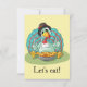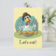 Um peru de desenho animado é visto sentado para um jantar de Ação de Graças neste adorável convite de jantar com a data, hora e local mostrados no verso