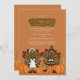 Um convite jante humorístico para o Dia de Ação de Graças, com um casal de peru vestido de peregrino de fundo de abóbora.