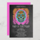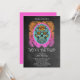 Um negrito no seu rosto dia sombrio do convite de festas morto com o crânio de açúcar pintado em laranja, turquesa e rosa quente, num fundo do quadro-pessoal com uma fonte peculiar. nA parte traseira do cartão é rosa-quente. Claro que chamam a atenção!morto