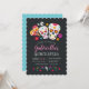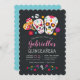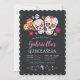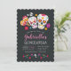 Planeje a festa de aniversário do tema do Dia dos Mortos da quinceanera com estes convites bonitos com crânios de açúcar decorados de forma festiva e flores coloridas. Personalize com o seu tema Día de Muertos quinceañera detalhes em letras brancas e cor-de-rosa sobre fundo preto.