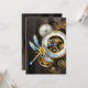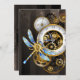 Marcadores antigos com engrenagens de ouro e latão, decorados com libélula mecânica sobre fundo castanho listrado. Steampunk.