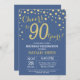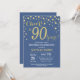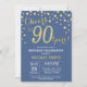 Convite de Aniversário de 90 com Fundo de Diamante Azul e Dourado. Dourado Confetti. Aniversário Adulto. Homens ou Mulheres Aniversário. Para mais personalização, clique no botão "Personalizar" e use a ferramenta design para modificar este modelo.