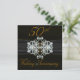 Sofisticado e elegante aniversário de cinquenta anos de casamento com fundo de cetim preto e fita de cetim preta com diamantes em um estilo fechado que continua na parte de trás. A parte de trás tem uma sobreposição de cartão falso prateado, dourado e nacarado montada nos cantos com fechos de diamante. Design original de Holiday Hearts Designs (todos os direitos reservados).