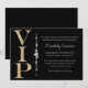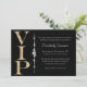 Este convite de festa personalizado apresenta um tema glamoroso e elegante em um fundo preto. O título VIP é impresso em um design brilhante dourado à esquerda. Uma faixa de diamantes separa a área de texto. É perfeito para uma festa de aniversário, chá de noiva ou outra celebração fabulosa.