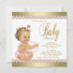 Convite de chá de bebê rosa e dourado com belo fundo dourado e adorável bebezinho vestindo calças rosa com babado e colar de pérolas em um belo fundo de diamante de pérolas rosa e dourado. Este adorável convite de chá de bebê feminino rosa e dourado é facilmente personalizado para o seu evento, adicionando os detalhes do evento, estilo de fonte, tamanho e cor da fonte e texto. Você também pode adicionar uma cor de fundo. Este é um design impresso sem nenhum tipo de folha, brilho, joias, laços, etc.