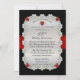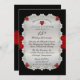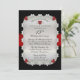Convite de aniversário de 15 anos de casamento brilhantemente sofisticado e elegante com fundo preto e fita de cetim impressa em vermelho rubi com diamantes e corações impressos em rubi dispostos em uma moldura retangular arredondada. A fita de cetim vermelha falsa e o fundo preto continuam na parte de trás para um visual sofisticado e polido. Design original da Holiday Hearts Designs (todos os direitos reservados). Por favor, note que todos os enfeites são impressos.