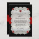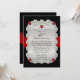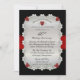 Convite de aniversário de 40 anos de casamento brilhantemente sofisticado e elegante com fundo preto e fita de cetim impressa em vermelho rubi com diamantes e corações impressos em rubi dispostos em uma moldura retangular arredondada. A fita de cetim vermelha falsa e o fundo preto continuam no verso para um visual sofisticado e polido. Design original da Holiday Hearts Designs (todos os direitos reservados). Por favor, observe que todos os enfeites são impressos.