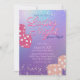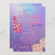 Este convite de festas personalizado apresenta um tema glamouroso do Jogo da Noite das Senhoras sobre um fundo colorido iridescente. O título "Damies Night" é impresso em uma letra de script brilhante rosa, com uma sombra cor-de-rosa neon. O título da Noite de Jogo é impresso abaixo em roxo. Luzes de fada giratórias soam as partes superior e inferior. Os dados de brilho nas rosas claro e escuros são colocados em ambos os lados da informação do evento.