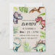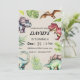 A cute dinosaur-themed kids birthday invitation, soft watercolor illustration style. Beige/cream background with tropical green leaves (monstera, palm, jungle foliage) arranged around the edges as a frame. Adorable friendly dinosaurs in watercolor: a purple triceratops, a flying pterodactyl, a smiling red T-rex, a blue long-neck dinosaur, and a green stegosaurus, all evenly spaced around the border. Playful, child-friendly look with soft shading and pastel colors.