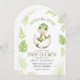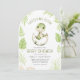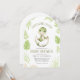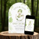 Bem-vindos a sua pequena chocada com este adorável convite para chás de fraldas de dinossauro de aquarela! Apresentando um doce dino bebê espreitando de um ovo salgado, cercado por sotaques verdes macios, esta design caprichosa é perfeita para um tema "Chapeuzinho". A paleta de cores neutra em termos de gênero faz dela uma escolha excelente para celebrar qualquer chá de fraldas. Personalize com os detalhes do seu partido para criar uma lembrança memorável para a família e os amigos.