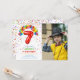 Estes convites de festas de aniversários bonitos e alegres apresentam um balão vermelho número 7, balões coloridos e confete com uma foto da sua escolha. Personalize os convites de festa de aniversário adicionando o nome, a idade e os detalhes da festa do seu filho.