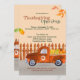 Convide seus amigos e família para uma Casa Aberta FUN de Ação de Graças ou outro evento com este design de feriado festivo e divertido personalizado apresenta um caminhão laranja rústico e tendencioso cheio de abóboras festivas e seu monograma inicial na porta. A parte traseira do cartão apresenta a frente do mesmo caminhão de colheita. Clássico e contemporâneo, moderno e festivo, este convite de Ação de Graças é fácil de personalizar com seu próprio nome, endereço e informações de partido. Design por T.K. em frente