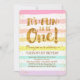 Que graça é ser um! Celebre o primeiro aniversario do arco-íris feminino com listras pastel e o coração de confete de ouro no primeiro aniversário.