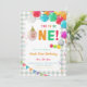 Modelo de convite de aniversário divertido de ser um, modelo digital de primeiro aniversário divertido de ser um com balões coloridos, xadrez verde e confetes com uma foto de sua escolha. Personalize os convites da festa de aniversário adicionando o nome da criança, idade e detalhes da festa.