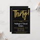 Um convite de festa de aniversário de casamento de 30 anos preto e dourado, elegante, simples mas impressionante. Texto com letra glamorosa no topo e texto dourado abaixo com o nome em branco destacado