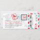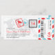 Uma passagem de embarque inspirou o convite do bilhete com detalhes do selo do passaporte do divertimento e listras do correio aéreo. Mostrado nas máscaras do Aqua, vermelho brilhante, preto, obscuridade - cinzas e luz - cinzas. O verso inclui o espaço extra para toda a informação do hotel, do viagem ou do Web site.
