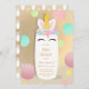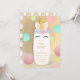 Um convite com uma ilustração dos desenhos animados de uma garrafa de bebê com orelhas do unicórnio e as pestanas escuras. A parte dianteira do convite tem um fundo das bolinhas. (O fundo goldtone é não-folha)