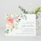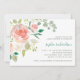 Este pêssego floral bonito do olhar da aguarela das características do convite floresce com eucalipto e outras folhas na moda do verde.