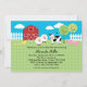 Convite bonito e colorido do chá de fraldas com um tema da fazenda. Caracteriza animais de fazenda adoráveis, um celeiro vermelho, árvores e uma cerca escolhida em um fundo verde-claro e das bolinhas do azul. Este design unisex ajustará o tom para um chá memorável. Adicione seu próprio fraseio.