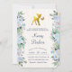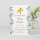 Um cervo e uma borboleta do bebê da folha de ouro sentam-se entre um quadro de flores azuis bonitas da aguarela com um fundo de madeira claro. Um convite maravilhoso do chá de fraldas do tema da floresta.