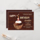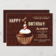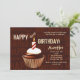 Um unisex, convite do aniversário que bem-é serido para toda a idade. Featured é um cupcake gostoso, do chocolate com cobertura do creme do chicote da baunilha e uma única vela listrada vermelha e branca. O fundo chocolate-colorido tem as palavras "feliz aniversario" escrito por toda parte.