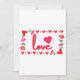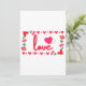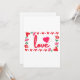 Este convite apresenta a palavra “Amor” em uma fonte de impressão única com letras vermelhas e contorno rosa dentro de um design de estilo retangular com corações vermelhos e rosados, rosas e coração em estilo morango em dois cantos neste tema do Dia dos Namorados. Impresso em um papel clássico, completo, com 17,5 pt de espessura e acabamento matte não revestido com textura de casca de ovo feito e impresso nos EUA com "Amor" impresso no verso.