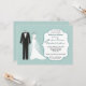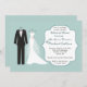 Este convite moderno caracteriza o smoking de um noivo e o vestido de casamento pretos da noiva branca em um fundo de água-marinha. Você pode usar este convida para anúncios wedding, convites da festa de noivado, salvar a data, o jantar de ensaio ou os convites wedding do almoço.