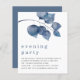 O Festa de Folhagem de Artsy Azul Convidou. Um alternativo MENOR de 4,5" x 5,6", compatível com o orçamento. Disponível em um STOCK de PLACA SEMI GLOSS 110 lb ou um STOCK de PAPEL THINNER SATIN FINISH 80 lb. Os envelopes são um extra opcional. Estilo informal. Folhas azuis de cor grande moderna decoram a parte superior e a posição é grande abaixo em na moda com os detalhes na parte inferior. Personalize facilmente o texto para seus próprios detalhes.