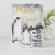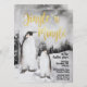 Convite para festa de Natal de Tuxedo Royale, com uma cena de neve em floresta a preto e branco, com dois pinguins anunciando um Jingle 'n Mingle em um rico de ouro cintilante, com letra traçada ao longo do topo do convite.