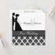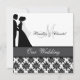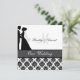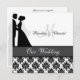 Impressão preto e branco do damasco com uma banda cinzenta, uns noivos da silhueta, e áreas que você pode personalizar com seus nomes, inicial do monograma, cerimónia de casamento e informação da recepção em um convite wedding personalizado que seja elegante e tradicional tudo em um!